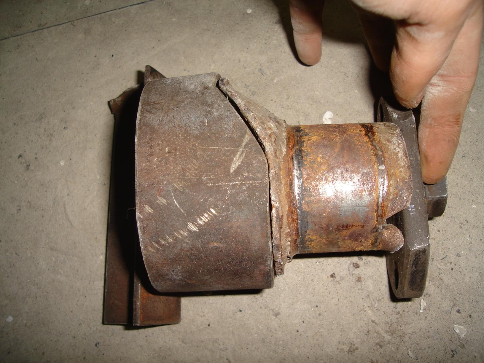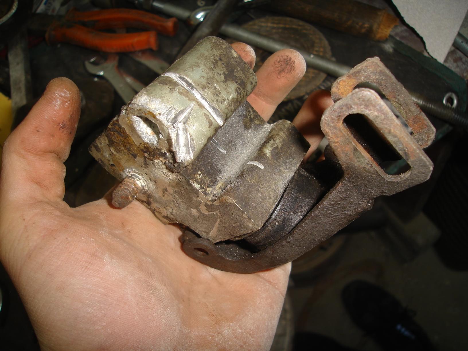 Pierwsza czynność to popuszczenie śrub od kół i podniesienie auta na taką wysokość, żebyśmy swobodnie kręcili śruby pod spodem i nie obijali sie o wszystko. Ja postawiłem do na 2 stopach + 2 kawałki kantówki drewnianej, żeby auto nie ześlizgnęło się z samych stopek. Podstawiłem je na tym wzmocnieniu metalowym które jest przykręcone pod rurą wydechową. Ściągamy koła i bierzemy się za rozkręcanie amortyzatorów tylnych. Czynność tą wykonujemy wg. PORADNIKA Następnie podpieramy czymś belkę żeby nam nie wisiała przez czas w którym wykręcimy nieszczęsny korektor hamowania. Ta robota jest chyba najgorsza, śruby są zapieczone i rzadko zdarza się żeby były do odkręcenia. Odkręcamy korek wlewy płynu hamulcowego i odkręcamy przewody łączące belkę z korektorem i 4 przewody wchodzące do korektora specjalnym kluczem 11. Jak odkręcimy to najlepiej spuścić cały płyn hamulcowy wypompowując go pedałem hamulca, bo później będzie nam kapało na głowę. Tak czy tak płyn należy wymieniać co ok 40 000km więc opłaca się to zrobić od razu. Ja miałem korektor do wymiany więc miałem troszkę ułatwioną sprawę, ale nie chciałem obcinać metalowego uchwytu. Wziąłem przecinak i rozciąłem nakrętki które są wspawane w uchwyt mocujący korektor od strony tulei. Jedną dałem rade przeciąć a z drugą juz nie miałem nerwów i musiałem wziąźć "boszke" i odciąłem go niszcząc go doszczętnie.