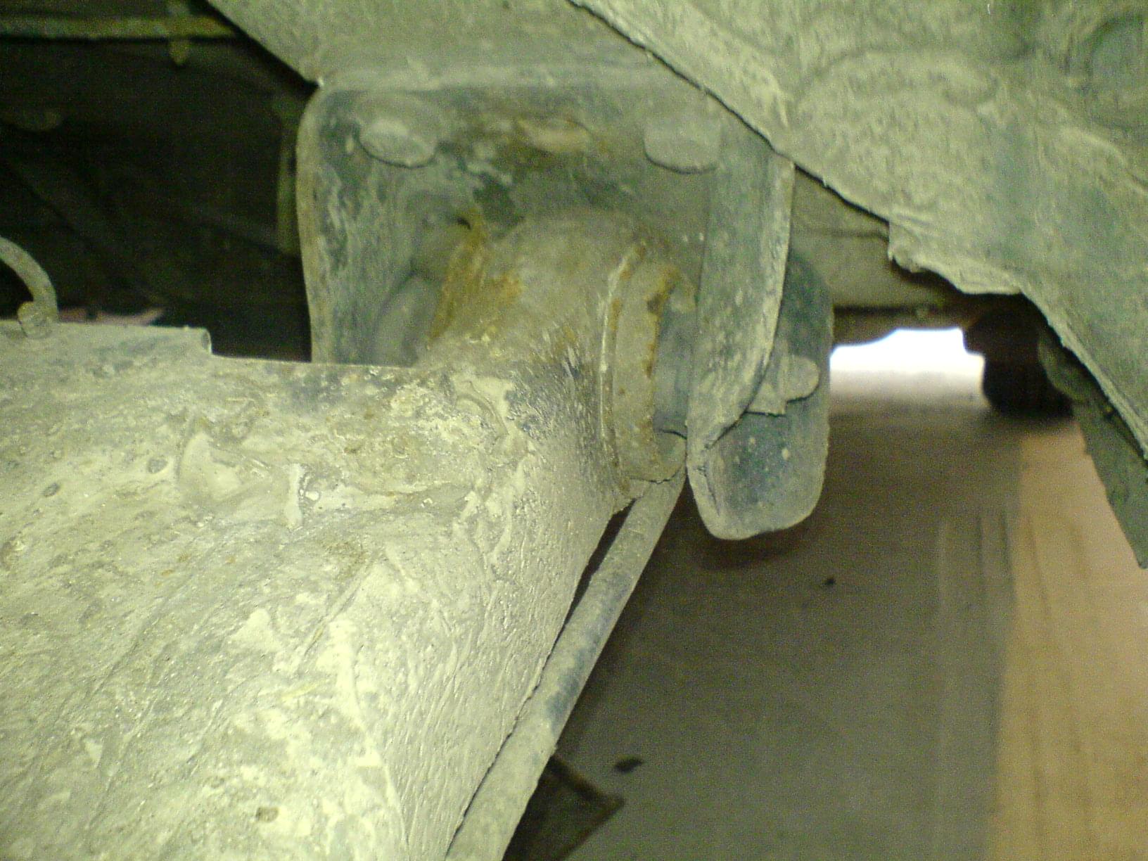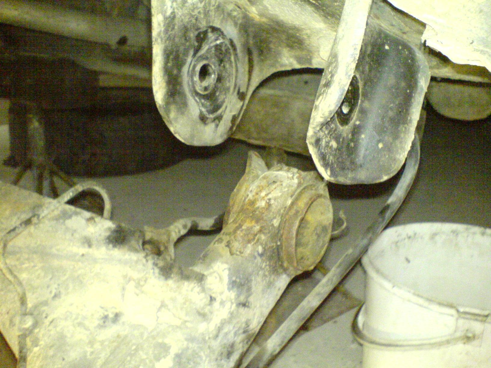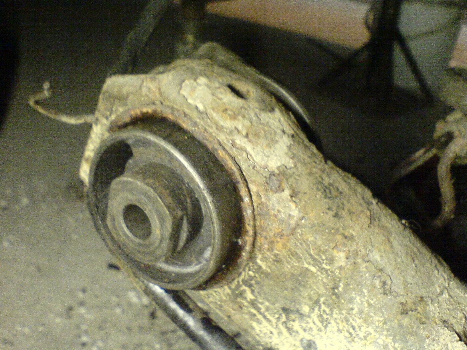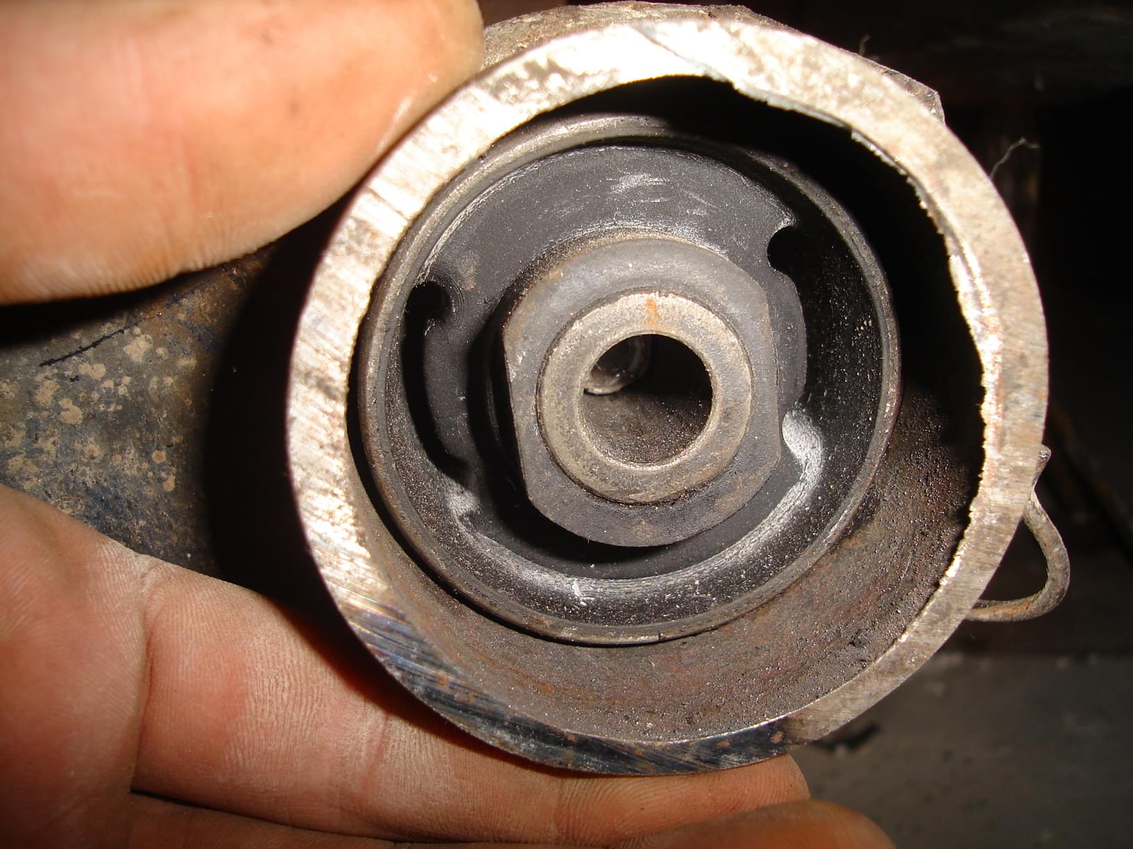 Podpieramy całą belkę i bierzemy się za wyciągnięcie starych tulei. Ja wybiłem młotkiem stare gumy i została tylko metalowa osłona całości. Następnie rozcinamy najlepiej w dwóch miejscach tuleje i wybijamy ją. Ważne Zapamiętajmy położenie starej tulei tj. Wystawanie i położenie w gnieździe.