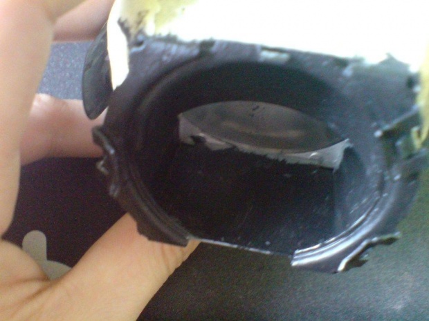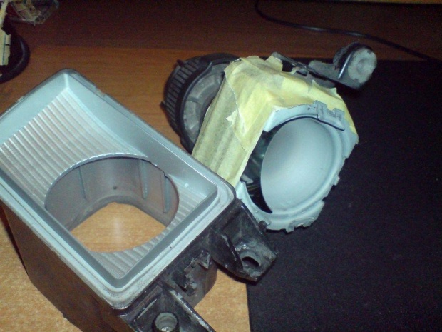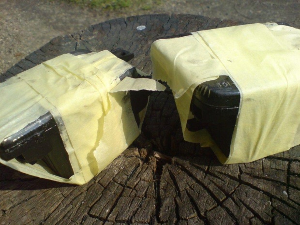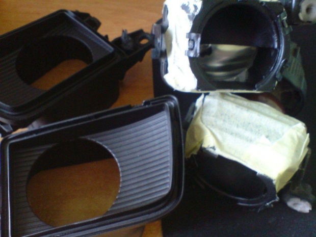 6) Sklejamy halogeny. Zanim to zrobimy trzeba usunąć resztki kleju z szybek halogenu gdyż zostawiło by to bardzo widoczne szare ślady. Najlepiej użyć tapeciaka etc. Wnęki wypełniamy czarnym silikonem - nie za grubo bo po ściśnięciu szybki klej może wlecieć do środka i trzeba będzie od nowa kleić. Po złożeniu sklejamy taśmą i zostawiamy do wyschnięcia.