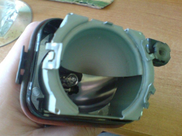 2) Ok szkła są już oddzielone od obudowy i najtrudniejsza rzecz za nami. Teraz trzeba odczepić soczewkę od halogenu. W tym celu odginamy lekko 3 blaszki płaskim wąskim śrubokrętem i delikatnie wyjmujemy soczewkę. Tak więc mamy już taki zestaw:
