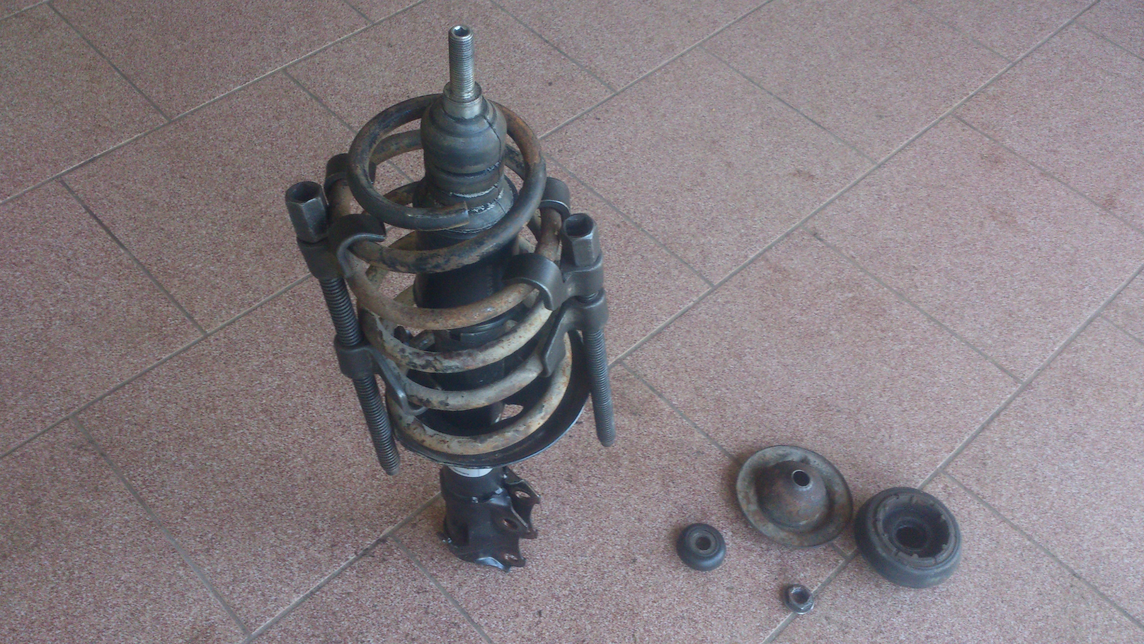 7. Po wyjęciu amortyzatora zakładamy ściągacze do sprężyn i skręcamy tak aby swobodnie odkręcić górne mocowanie .