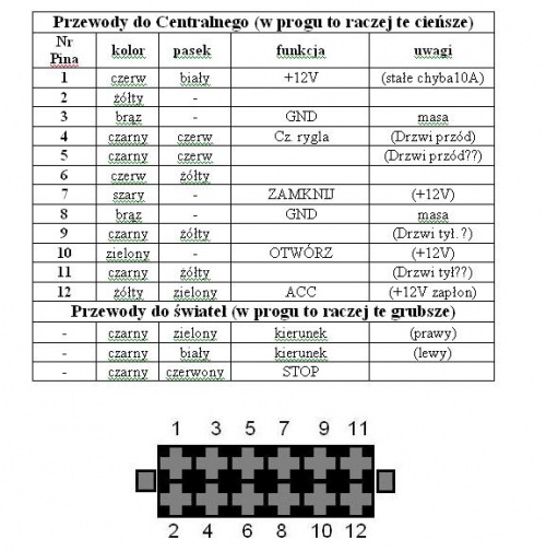 a jak nie masz ? To do zarowki 12V podepnij dwa przewody. Jeden podlacz do masy samochodu a drugi przykladaj do jednego z 6 przewodow od centralki i po nacisnieciu przycisku na pilocie patrz kiedy zaswieci sie zarowka. Kiedy przy nacisnieciu np zamykania na pilocie zaswieci na bialym przewodzie to chyba jasne gdzie jest co
