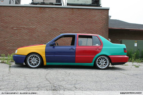 mam Golfa 3D, którego trzeba pomalować i tak pomyślałem, że można by póść tropem Harlequina, tylko trochę zmienić, np żeby auto nie było malowane symetrycznie, np dach inny kolo niż tylne ćwiartki, lewe drzwi inne niż prawe, błotniki też różne. w USA jeździ np Jetta mk4 pomalowana w takie barwy i wygląda to fajnie. No i jest jedna zaleta jak dal mnie lepiej mi idzie wyklejanie niż lakierowanie