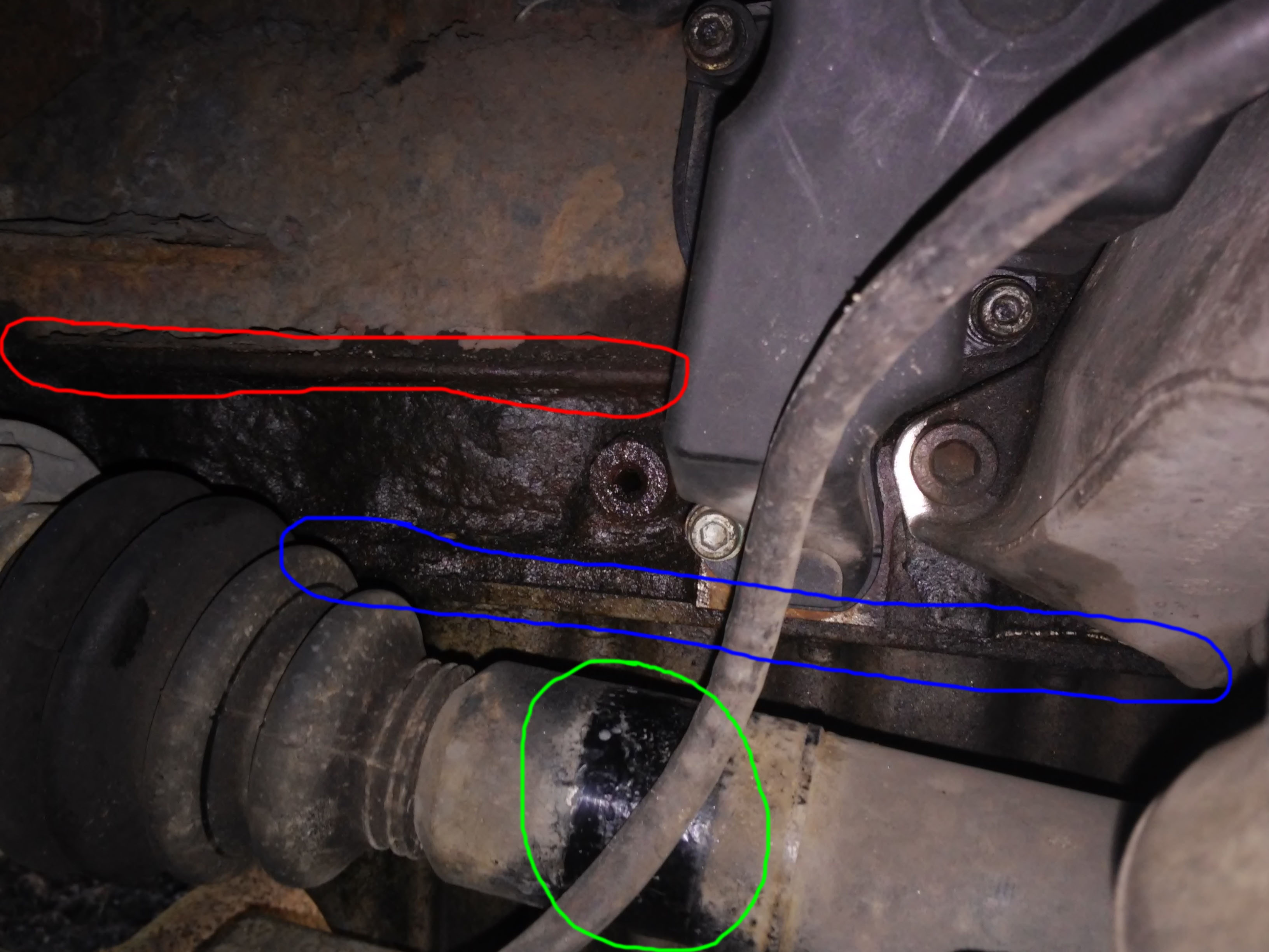 z tym wyciekiem przy odmie chodzi mi to czy ta wystająca blacha (foto poniżej) zaznaczona kolorem czerwonym to po prostu taka jest ściana silnika (nie żadne łączenie żadnych części), bo miska olejowa to dopiero to łączenie kolor niebieski? i co to za przetarcie kolor zielony?